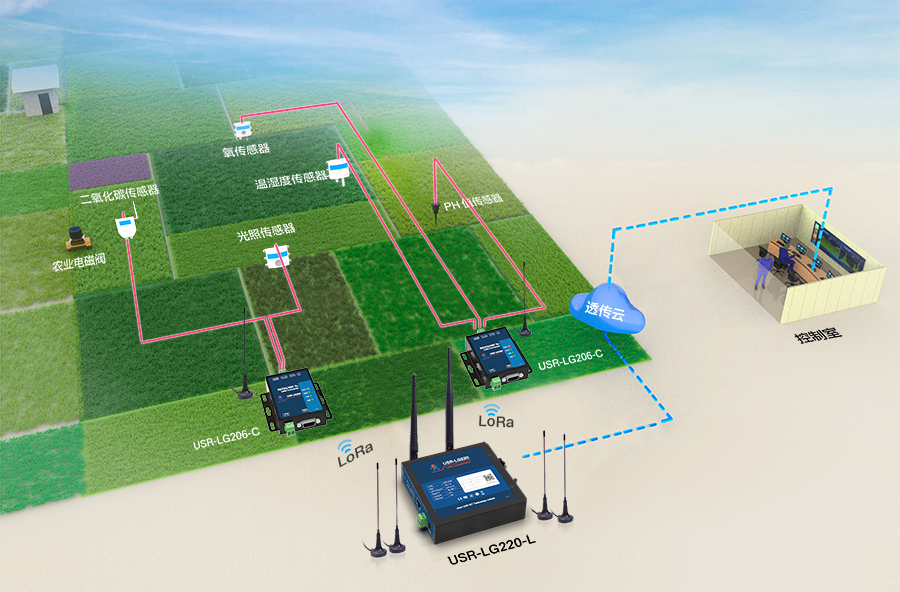 1、在農(nóng)田里部署溫濕度、二氧化碳、光照等終端傳感器,通過RS232/485與LoRa數(shù)傳終端USR-LG206-C相連