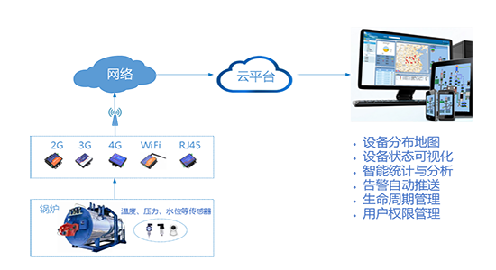 通過2G/3G/4G網(wǎng)絡(luò)或?qū)拵ЬW(wǎng)絡(luò)實現(xiàn)鍋爐設(shè)備聯(lián)網(wǎng),實時接收鍋爐設(shè)備運(yùn)行參數(shù),如溫度、水位、壓力參數(shù)等,并進(jìn)行存儲和管理。通過瀏覽器或手機(jī)客戶端實時顯示所有已聯(lián)網(wǎng)設(shè)備的實時運(yùn)行情況,對鍋爐狀態(tài)數(shù)據(jù)進(jìn)行智能分析,為設(shè)備運(yùn)維階段故障分析、高效管理和穩(wěn)定運(yùn)行提供有力支持。