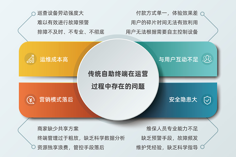 隨著共享經(jīng)濟(jì)的發(fā)展,自助咖啡機(jī)、自助榨汁機(jī)、自助充電樁、自助洗衣機(jī)等共享自助終端已從各個(gè)方面融入大眾生活,但伴隨投放量的增加,傳統(tǒng)自助終端在運(yùn)營(yíng)過(guò)程中也存在如下問(wèn)題: