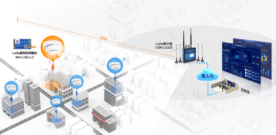 LoRa智慧煙感內(nèi)嵌LoRa星型組網(wǎng)模塊WH-L102-L-C,搭配LoRa集中器USR-LG220-L自組網(wǎng)工作,數(shù)據(jù)通過(guò)LoRa模塊上報(bào)至LoRa集中器,LoRa集中器可通過(guò)以太網(wǎng)或4G通信方式將數(shù)據(jù)集中上傳至云服務(wù)監(jiān)控平臺(tái)。