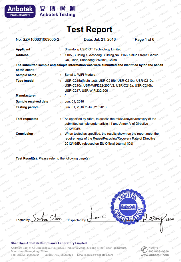 WIFI模塊C21系列 WEEE認(rèn)證